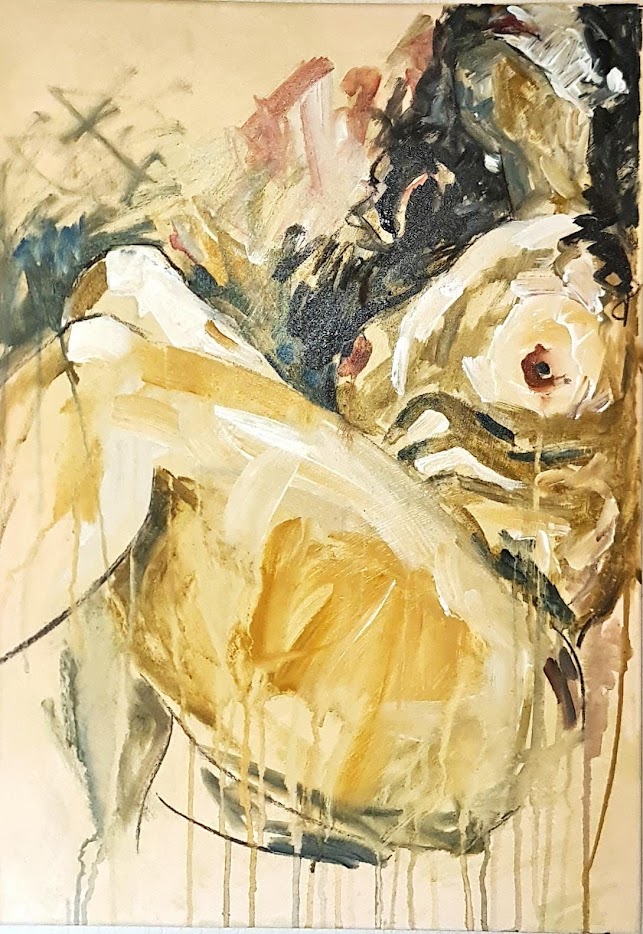 Der Körper erscheint fragmentiert, fast wie ein Echo vergangener Nähe. Die Wärme des Ockers trifft auf das Chaos der dunklen Striche, als würden zwei Seelen in einem einzigen Moment aufeinandertreffen – und sich zugleich verlieren.