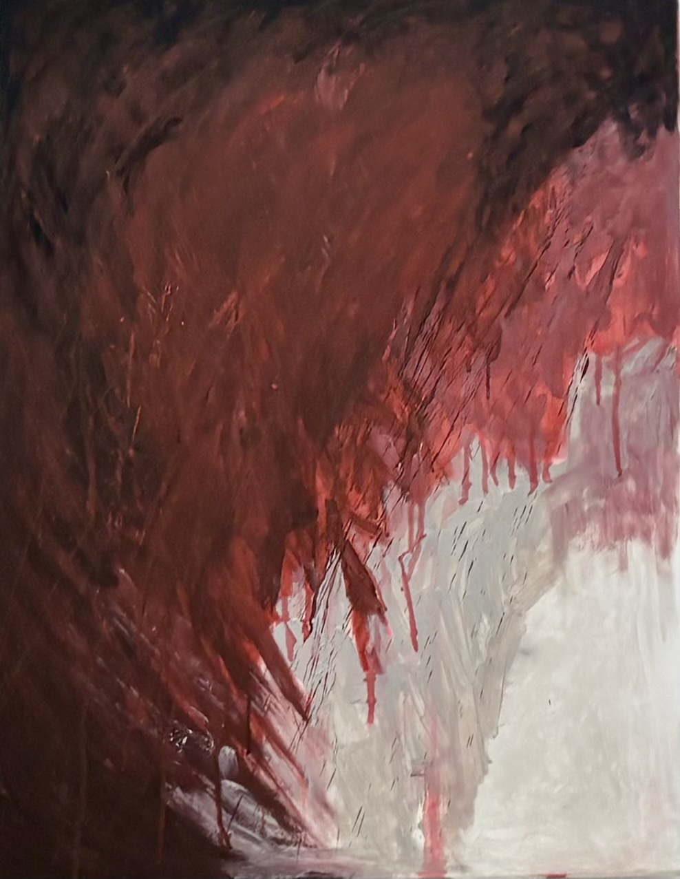 Ein Sturm aus Rot und Dunkelheit, ein Tanz zwischen Kraft und Auflösung. Die Farben strömen nach unten, tropfen wie Erinnerungen oder Emotionen, die ihren Weg suchen.