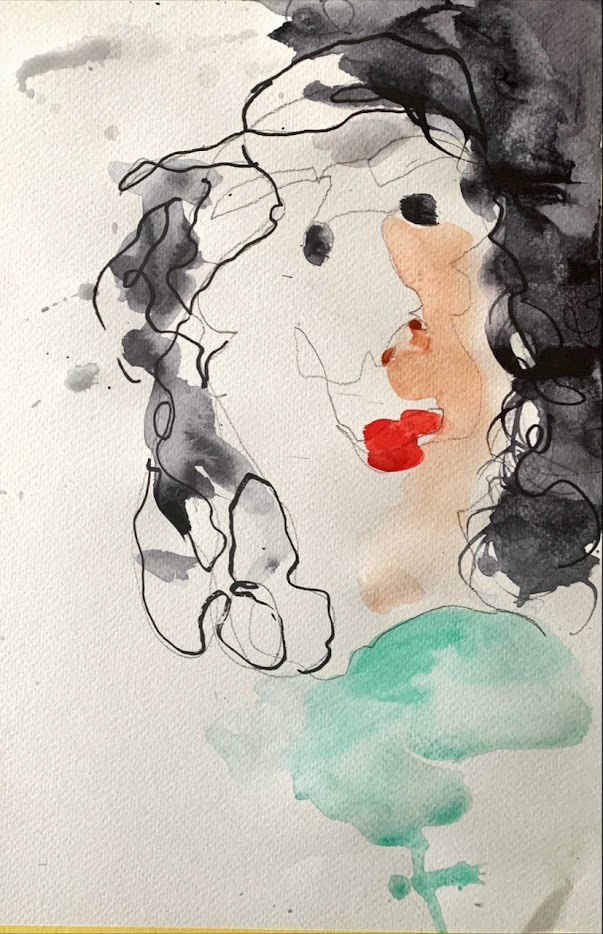Ein Gesicht, kaum greifbar – nur angedeutet durch flüchtige Striche und fließende Farben. Die roten Lippen setzen einen starken Akzent, ein Kontrast zur sanften Auflösung der Konturen.