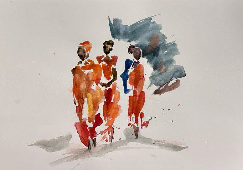 Drei Figuren, vereint in Bewegung, in leuchtenden Rot- und Orangetönen. Ihre Formen sind angedeutet, doch ihre Verbindung ist spürbar.